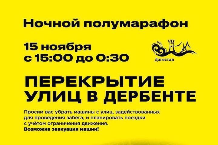 Движение в центре Дербента будет перекрыто в субботу, 15 ноября, с 15:00 до 00:30 в связи с проведением полумарафона «Огни Дербента».